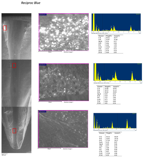 RB: Debris was observed at 100× magnification, the inner dentin surface presented a uniform morphology with a modest number of grooves. Differences were observed at the coronal medium and apical portion of retreated roots. The coronal third revealed few areas filled with high electron dense remnants. Analysis of these areas at 3000× magnification revealed the typical morphology of artificial smear layer mixed with filling material: fine granules occluded dentinal tubules and contained W and Si and the other sealer components. Rare dentinal tubules were visible most of which filled by sealer (W presence). The medium third presented little debris, dentin smear layer (Ca and P), and some open and clean (no smear plugs) dentinal tubules. The apical third presented few filling debris, but many dentinal tubules still were filled with sealer and smear layer, as confirmed by W, Zn, and Si (Figure 5).