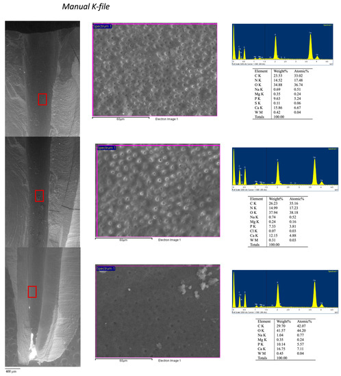 ESEM-EDX was used to detect morphology, elemental composition of dentin, and chemical modification induced by irrigation and retreatment instrumentation techniques. EDX spectroscopy was innovatively used to identify and to detect remnants and debris composition still present on dentin surface after retreatment procedures.