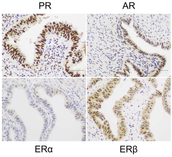 - Maclean, A.; Bunni, E.; Makrydima, S.; Withington, A.; Kamal, A.; Valentijin, A.; Hapangama, D.K. Fallopian epithelial cells express androgen receptor and have a distinct hormonal responsiveness when compared with endometrial epithelium. Hum. Reprod. 2020, in press. [Google Scholar]