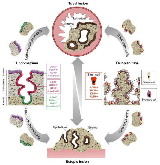 - Hapangama, D.K.; Drury, J.; Da Silva, L.; Al-Lamee, H.; Earp, A.; Valentijn, A.J.; Edirisinghe, D.P.; Murray, P.A.; Fazleabas, A.T.; Gargett, C.E. Abnormally located SSEA1+/SOX9+ endometrial epithelial cells with a basalis-like phenotype in the eutopic functionalis layer may play a role in the pathogenesis of endometriosis. Hum. Reprod. 2019, 34, 56–68. [Google Scholar] [CrossRef]