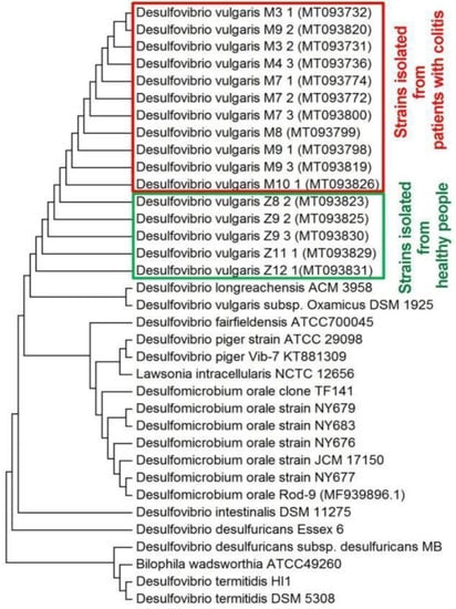 The dominant species of SRB in the human intestine belong to Desulfovibrio sp. [,,,]. The studies emphasize connections between the presence of SRB in the intestines and the prevalence of ailments, such as cholecystitis, brain abscesses and abdominal cavity ulcerative enterocolitis [,,,]. SRB are not the only organisms of the intestine producing H2S. Although SRB isolates coming from the intestine of humans have been reported to belong almost exclusively to Desulfovibrio sp., other genera are also part of the SRB microbiota: Desulfotomaculum, Desulfobulbus, Desulfomicrobium, Desulfomonas, Desulfonema [,]. In the intestine, SRB, mainly Desulfovibrio sp., form biofilms together with other intestinal bacteria, such as species of Bacteroides, Pseudomonas, Clostridium and Escherichia. Desulfovibrio spp. are also present in a certain percentage of the healthy population [,,]. They were first isolated from human feces in 1976 by W.E.C. Moore and identified as Desulfomonas pigra [], which was then reclassified as Desulfovibrio piger []. Desulfovibrio belongs to Desulfovibrionaceae []. SRB are present in various environments and they make a high impact on animal and human health since their presence is a possible contributing factor in the development of inflammatory bowel diseases [].