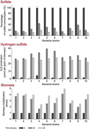 Ten bacterial strains from healthy and unhealthy persons were compared by the parameters sulfate consumption, H2S production and biomass accumulation (Figure 3). The highest sulfate consumption was observed in all bacterial strains after 24–48 h. The highest rate of this consumption was detected for SRB Strain 1, Strain 2 and Strain 7 (83–90%, 84–89%, 85–91%, respectively). The lower level of sulfate consumption within the first 24 h was observed for Strain 4, Strain 5, Strain 9 and others. In this case, the slowest sulfate consumption (56%) was detected in Strain 4. It should be noted that the sulfate level was stable and almost constant in the medium of all strains after 48 h of cultivation, regardless of their provenience.