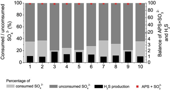 The sulfate concentration in the liquid medium was measured by the turbidimetric method after time intervals of the cultivation. In total, 40 mg L−1 BaCl2 solution was prepared in 0.12 mol L−1 HCl and mixed with glycerol in a 1:1 ratio. The supernatant of the sample was obtained by centrifugation at 5000× g at 23 °C and 1 mL was added to 10 mL of BaCl2: glycerol solution and carefully mixed as described before []. The absorbance of the mixed solution was measured after 10 min at 520 nm (Spectrasonic Genesis 5, Ecublens, Switzerland). A cultivation medium without bacteria growth was used as a control.