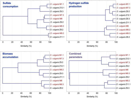 Multivariate analysis of the results obtained from sulfate consumption, H2S production and biomass accumulation were performed. Cluster analysis is conducted regarding each of these variables separately and combined (Figure 5); with the aim of sorting the different isolated strains into groups according to the measured variables.