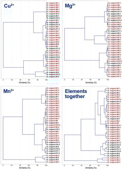 For copper, the first subcluster was observed for those strains that do not have a detectable concentration of the element (five from patients and two from healthy subjects). Remaining strains equally distributed in the other subclusters, as it happens with Mg2+, finding two main clusters for both elements (Figure 7). Clusters based on Mn2+ show that most strains coming from healthy people tend to form subclusters. When combining the cluster analysis of all elements, a similar outcome was observed, in which the majority of strains from healthy individuals are grouped together (7 out of 11).