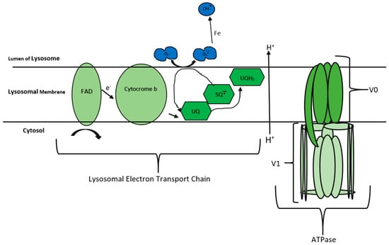The lysosomal electron transport chain (LETC), adapted from Gille and Nohl [14]. The figure indicates how coenzyme Q10 (CoQ10) oxidation and reduction are utilised by the lysosome to move H+ into the lumen. As eluded to by Gille and Nohl [14]. The oxidation of cytoplasmic nicotinamide adenine dinucleotide (NAD) to NADH+ by the flavin-adeine dinucleotide (FAD) present in the lysosomal membrane, leads to the single electron transfer to cytochrome b. Additionally, it has been reported that the oxidation of cytochrome b was found to be proportional to the amount of ubiquinone (UQ) present in the lysosomal membrane. Ubiquinone structure allows for the transfer of two electrons leading to the production of either partially reduced ubisemiqinone or the fully reduced ubiquinol. CoQ10’s structure then allows it to pass freely into the lysosomal lumen, transferring the electrons via molecular oxygen. The basic structure of the lysosomal ATPase is also outlined and is adapted from the paper by Zoncu, et al. [15]. The structure and function of this ATPase is similar to that found in the mitochondria, although it is involved in the hydrolysis of ATP rather than the synthesis of this molecule. It consists of 13 subunits and is divided into 2 domains, V0 and V1. The V0 domain is involved in translocating protons (H+)’s across the lysosomal membrane and into the lumen. The V1 domain is involved in the hydrolysis of ATP which provides the energy for the translocation of H+ ions against the H+ concentration gradient for transport into the lumen. [15,16]. Abbreviations: FAD, flavin-adeine dinucleotide; UQ, ubiquinone; SQ, semiquinone.