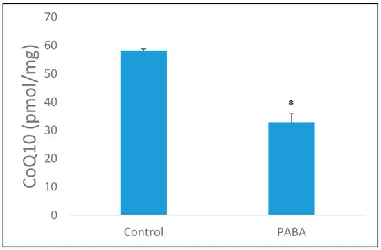 The endogenous CoQ10 concentration in both control and para-aminobenzoic acid (PABA)-treated (1 mM, 5 day) SH-SY5Y cells. CoQ10 concentration standardised to protein baseline (mg of protein). Data available in supplemental data under Table S2. Levels of significance * p < 0.05; n = 10.