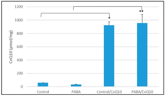 The cellular CoQ10 concentration, after treatment with 5 µM CoQ10 over 3 days. Figure shows concentration of CoQ10 after PABA treatment and subsequent CoQ10 treatment. CoQ10 concentration standardised to protein baseline (mg of protein). Comparison of groups was carried out as follows: control group vs. PABA, Control group vs. Control CoQ10 treated, PABA group vs. PABA CoQ10 treated. Data available in supplemental data under Table S3. Level of significance * p < 0.05, ** p < 0.05; n = 26.