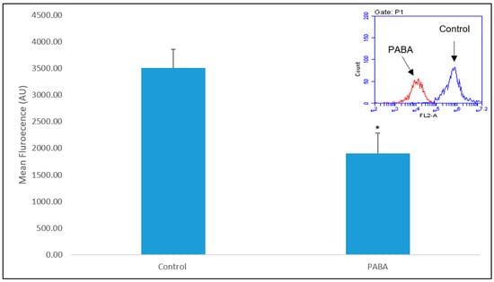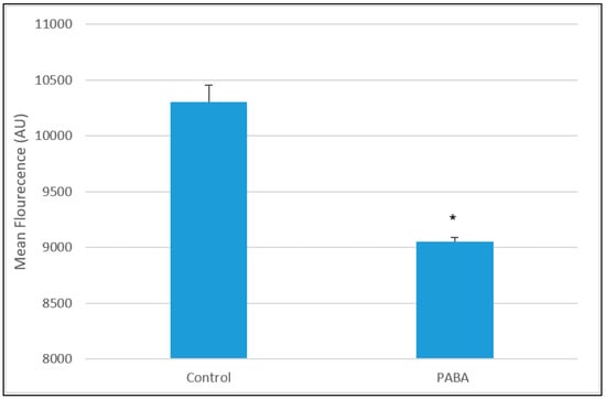 Mean LysoSensor fluorescence for PABA-treated cells vs. controls. Data available in supplemental data under Table S6. Significance levels * p < 0.05; n = 94.