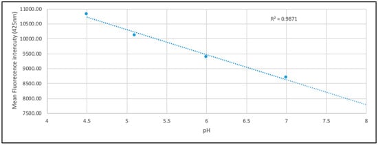 This study employed two independent fluorescent probes in order to evaluate lysosomal pH. Firstly, the LS probe was used, incorporating a plate reader method. LS is a fluorophore designed to accumulate within acidic organelles as a result of protonation. Additionally, a result of this protonation is fluorescence quenching of the probe by its weak base side chain resulting in an increased fluorescence intensity [52]. The pKa of LS blue DND-167 is 5.1 meaning the probe is ideal for measuring low pH environments. In this study a set of standard pH controls were set up alongside each experiment, which showed that the change in fluorescence was proportional to the change in pH (Figure 5).