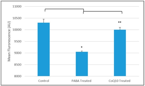 Analysis showed that there was a significant difference (p < 0.005) between the fluorescence of the non-PABA-treated cells and the CoQ10-deficient (PABA-treated) cells (Figure 4). In addition, there was a 35% (p < 0.05) decrease in median fluorescence on average in CoQ10-deficient cells when compared to the control (Figure 4).