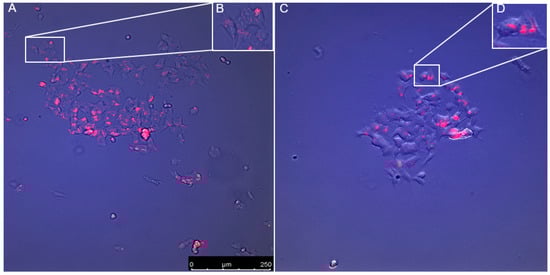 Distribution of the LysoTracker DND-99 probe in both control cells (A) and PABA-treated cells (B). (C) and (D) show small localisation of LysoTracker in the cells. Suggests that PABA has little to no effect on the cellular distribution of the probe. Images taken using the Leica DMI6000 fluorescent microscope, with the Leica LAS X software, at x40 (objective).