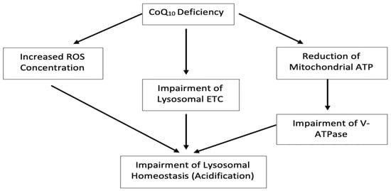 The majority of lysosomal enzymes are acidic hydrolyses requiring an acidic environment for optimum activity. Thus, the lysosomal lumen pH is intrinsically linked to its functionality [24,25]. When compared to the relatively neutral pH of the cytosol (7.2), it is clear that the lysosome must have a mechanism for the movement of H+ ions into the lumen against the concentration gradient. The lysosomal electron transport chain, LETC, was first observed by Gille and Nohl [14]. This is not dissimilar to the electron transport chain found in the mitochondria (METC) and could explain the presence of CoQ10 in the lysosomal membrane (Figure 1) [26,27,28,29,30]. As shown in Figure 1, CoQ10 is utilised in the LETC for its oxidation/reduction abilities. Gille and Nohl [14] noted that electrons are passed from Cytocrome b, onto ubiquinone (UQ), reducing to ubisemiquinone (SQ−), then an O2 molecule inside the lumen acts as a final acceptor, oxidising SQ− and moving H+ ions into the lysosome. Thus, it is not unreasonable to assume that a CoQ10 deficiency may result in an impairment of lysosomal activity as the result of a deacidification of the organelle. However, as yet, it is uncertain whether CoQ10 plays a fundamental role in maintaining lysosomal pH and this requires confirmation.