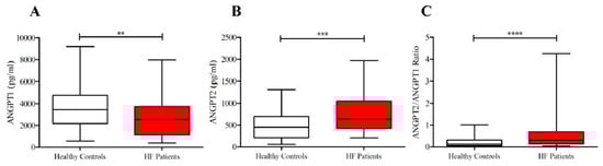 (A) Plasma concentrations of angiopoietin-1 (ANGPT1) in heart failure (HF) patients and in healthy controls; (B) Plasma concentrations of ANGPT2 in HF patients and in healthy controls; (C) ANGPT2/ANGPT1 ratio in HF patients and in healthy controls. Data are shown as the median (horizontal block line), the 25th and 75th percentiles (boxes), and the 5th and 95th percentiles (whiskers) (statistical analysis was performed by a Student’s t-test). ** p < 0.01; *** p < 0.001; **** p < 0.0001.