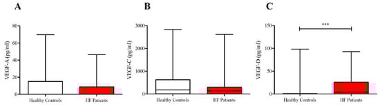 (A) Plasma concentrations ofvascular endothelial growth factor-A (VEGF-A) in heart failure (HF) patients and in healthy controls; (B) plasma concentrations of VEGF-C in HF patients and in healthy controls; (C) plasma concentrations of VEGF-D in HF patients and in healthy controls. Data are shown as the median (horizontal block line), the 25th and 75th percentiles (boxes), and the 5th and 95th percentiles (whiskers) (statistical analysis was performed by a Student’s t-test). *** p < 0.001.