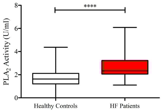 Plasma concentrations of sPLA2 activity in HF patients and in healthy controls. Data are shown as the median (horizontal block line), the 25th and 75th percentiles (boxes), and the 5th and 95th percentiles (whiskers) (statistical analysis was performed by a Student’s t-test). **** p < 0.0001.