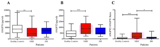 The concentrations of ANGPT1 were significantly reduced in NIHF compared to controls (Figure 4A). By contrast, the plasma concentrations of ANGPT2 were selectively increased only in NIHF compared to healthy donors (Figure 4B). Similarly, the ANGPT2/ANGPT1 ratio, a parameter of vascular permeability [63], was also increased only in NIHF patients compared to controls (Figure 4C). Importantly, no difference emerged between IHF group and healthy controls in the ANGPT2/ANGPT1 ratio, whereas there was a significant difference between the ANGPT2/ANGPT1 ratio in NIHF vs. IHF (Figure 4C). There were no differences in ANGPT1 or ANGPT2 between male and female values in both controls and patients. Moreover, the age of patients and the concentrations of the different mediators examined did not correlate.