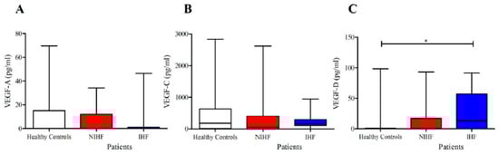 (A) Plasma concentrations of VEGF-A in IHF and NIHF patients and in healthy controls; (B) plasma concentrations of VEGF-C in IHF and NIHF patients and in healthy controls; (C) plasma concentrations of VEGF-D in IHF and NIHF patients and in healthy controls. Data are shown as the median (horizontal block line), the 25th and 75th percentiles (boxes), and the 5th and 95th percentiles (whiskers) (statistical analysis was performed by one-way ANOVA and Bonferroni’s multiple comparison test). * p < 0.05