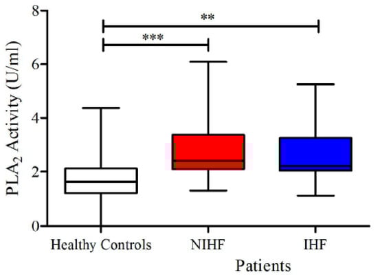 Plasma concentrations of sPLA2 activity in IHF and NIHF patients and in healthy controls. Data are shown as the median (horizontal block line), the 25th and 75th percentiles (boxes), and the 5th and 95th percentiles (whiskers) (statistical analysis was performed by one-way ANOVA and Bonferroni’s multiple comparison test). ** p < 0.01; *** p < 0.001.