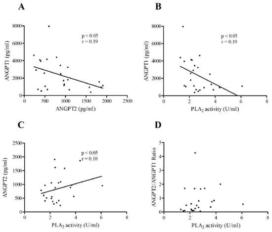 (A) Correlations between the plasma concentrations of ANGPT2 and ANGPT1 in NIHF patients; (B) correlation between circulating sPLA2 activity and the concentration of ANGPT1 in NIHF patients; (C) correlation between the plasma concentration of sPLA2 activity and ANGPT2 in NIHF patients; (D) correlation between the plasma concentration of sPLA2 activity and the ANGPT2/ANGPT1 ratio in NIHF patients. Spearman’s correlation coefficients (r) were calculated and are shown in the panels.
