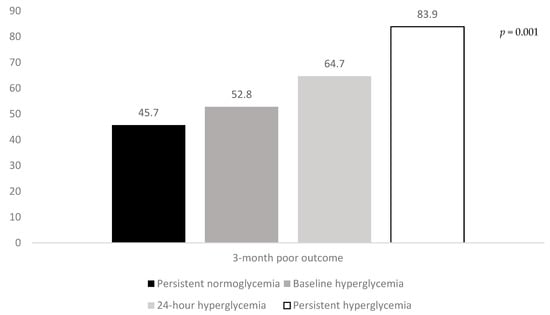 Rates of three-month poor outcome according to the hyperglycemic patterns.