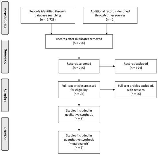 We identified 1728 potentially relevant articles from PubMed (n = 332), Embase® (n = 814), and Scopus® (n = 582). Through the screening of conference abstracts or references of the selected studies, one additional record was identified. After removing 1009 duplicates, 694 studies were additionally excluded by careful review of the titles and abstracts. Eighty-two were not in English; 242 were animal studies; 186 were letters, editorials, or case reports; 102 were reviews or book chapters; and 82 were obviously different from the wanted paper. Based on an in-depth full-text article review, we removed a further 19 studies considered irrelevant. One study was excluded because of insufficient outcomes. Ultimately, six unique studies were included in the quantitative synthesis. Figure 1 shows the PRISMA flowchart of this systematic review.