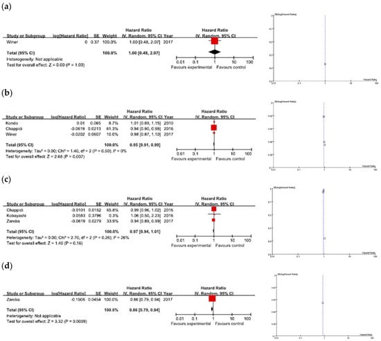 Of the three studies that referred to CSS, there was no heterogeneity (I2 = 0%, Chi2 = 1.40, p = 0.50). As shown in Figure 2a, the pooled HR of these studies revealed that higher numbers of LNs removed during RNUx were associated with improved CSS in patients with UTUC regardless of pN status (HR = 0.95, 95% CI: 0.91–0.99; p = 0.07) (Figure 2a).