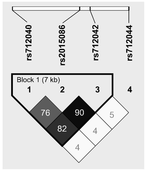 - Barrett, J.C.; Fry, B.; Maller, J.; Daly, M.J. Haploview: Analysis and visualization of LD and haplotype maps. Bioinformatics 2005, 21, 263–265. [Google Scholar] [CrossRef]