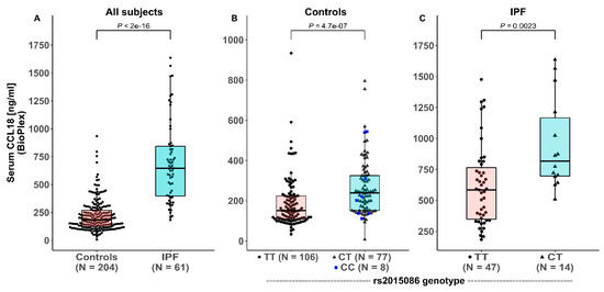 Serum CCL18 levels in healthy controls and patients with idiopathic pulmonary fibrosis (IPF) in the derivation cohort (A), depending on rs2015086 genotype in healthy controls (B), and IPF patients (C).