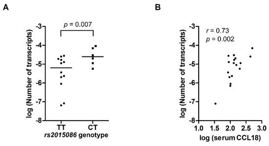 (A) mRNA expression of CCL18 in PBMCs from 18 healthy controls, expressed as the number of CCL18 transcripts per copy of β-actin, according to rs2015086 genotype. (B) Scatterplot showing the correlation between serum CCL18 levels and the number of CCL18 mRNA transcripts per copy of β-actin. Values on the X and Y-axis represent log-transformed values.