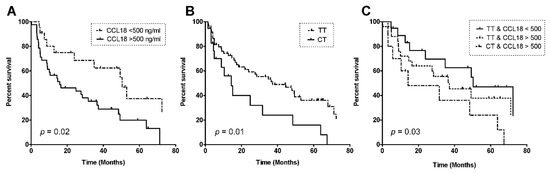 The survival rates were also analyzed in three groups based on a combination of the serum CCL18 level and genotype: CCL18low/TT group, median survival 50.4 months (95% CI 25.4–75.4); CCL18high/TT group, median survival 37.2 months (95% CI 13.1–61.3); CCL18high/CT group, median survival 14.3 months (95% CI 1.4–27.2) (p = 0.03), as shown in Figure 4C. The p-value was calculated via the Log Rank Test using Kaplan–Meier curves. There were no patients with low CCL18 and genotype CT.