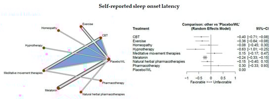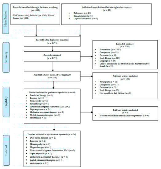 No study could be selected for ayurveda, chelation, energy healing therapy, folk medicine, reiki, vitamin, massage, music therapy, and qi gong. Of the 40 studies selected, 12 focused on melatonin as possible intervention for insomnia disorder [,,,,,,,,,,,], 9 on meditative movement therapies [,,,,,,,,] (particularly, n = 1 on yoga [], 6 on mindfulness [,,,,,] and 2 on tai chi [76.77]), 7 on exercise [,,,,,,], 5 on natural herbal pharmacotherapy [,,,,], 2 on light exposure [,], 2 on transcranial magnetic stimulation (rTMS) [,], 1 on homeopathy [], 1 on hypnotherapy [], and 1 on dietary supplements []. Two studies which evaluated exercise [,], one study evaluating melatonin [], and one study evaluating natural herbal pharmacotherapy [] were not included in the meta-analysis as complete data were not available. Control conditions of the included studies were waiting list (n = 11), placebo (n = 23), pharmacotherapy (n = 3), and CBT (n = 3).