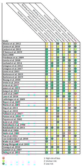 Included studies focused on different age categories, specifically: 5 studies focused on children and adolescents (<18 years) [,,,,], 23 studies focused on working-age adults (18–65 years) [,,,,,,,,,,,,,,,,,,,,,,], and 2 studies focused on elderly (>65 years) [,]. Ten studies used mixed age samples with adult and elderly participants [,,,,,,,,,]. One study was composed of only male participants [] and two studies of only female participants [,], while all other studies recruited mixed samples of both female and male participants. Seven studies excluded participants with past medical disorders [,,,,,,]; 15 of the selected studies excluded participants with other mental disorders than insomnia [,,,,,,,,,,,,,,]; eight studies excluded participants with comorbid medical disorders [,,,,,,,]; and 27 studies excluded participants with comorbid other sleep disorders than insomnia [,,,,,,,,,,,,,,,,,,,,,,,,,,].