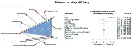 - Self-reported sleep efficiency: defined as a sleep efficiency index from sleep diaries or, if this was not reported, as sleep quality perception from sleep diaries;