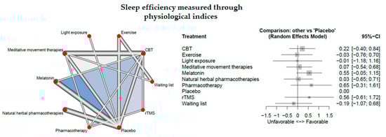 - Sleep efficiency measured through physiological indices: defined as sleep efficiency index measured by polysomnography, or, if this was not reported, by actigraphy;