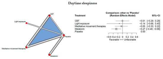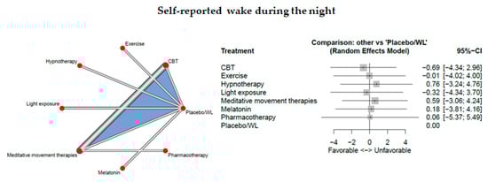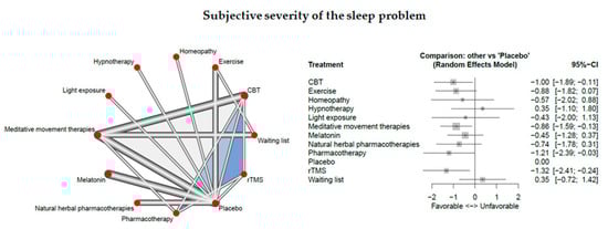 Cochran’s Q and Higgins I2 tests revealed very high heterogeneity between studies (tau^2 = 0.3396; I^2 = 95.7%). The net heat plot (see Supplementary Materials online Document S5) suggests that the designs that are together responsible for the majority of between-design heterogeneity are the following ones; (1) CBT-I vs. meditative movement therapies, (2) CBT-I vs. meditative movement therapies which is involved in a three-arm study: CBT-I, meditative movement therapies, and Placebo. Furthermore, the net heat plot suggests that the evidence for the treatment comparison CBT-I vs. meditative movement therapies from the designs CBT-I vs. meditative movement therapies (design from the three-arm study: CBT-I, meditative movement therapies, and Placebo) and CBT-I vs. Placebo (design from the three-arm study: CBT-I, meditative movement therapies, and Placebo) is inconsistent with the other evidence.