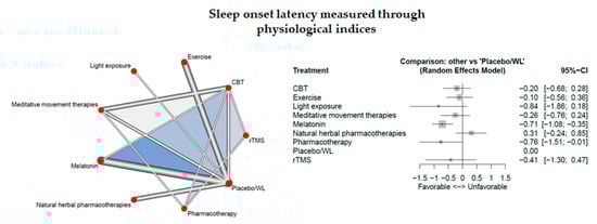 - Sleep onset latency measured through physiological indices: defined as sleep onset latency measured by polysomnography or, if this was not reported, by actigraphy.