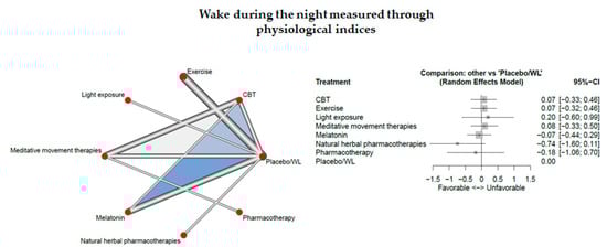 - Wake time during the night measured through physiological indices: defined as wake after sleep onset latency measured by polysomnography or, if this was not reported, by actigraphy.