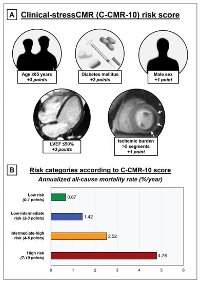 The main finding of the present study is that a straightforward clinical and stressCMR (C-CMR-10) score made up of 5 clinical (age, male sex, diabetes mellitus) and stressCMR variables (LVEF and ischemic burden) permits robust stratification of the long-term all-cause mortality risk in patients with known or suspected chronic coronary syndrome.