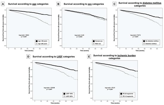 Kaplan–Meier curves to predict the risk of all-cause mortality according to the independent predictors in multivariable analysis. (A) Curves according to age categories (<65 and ≥65 years). (B) Curves according to sex categories (male and female). (C) Curves according to diabetes mellitus categories (with and without). (D) Curves according to LVEF categories (>50% and ≤50%). (E) Curves according to ischemic burden on stressCMR categories (≤5 and >5 segments with PD). Abbreviations: LVEF = Left ventricular ejection fraction. stressCMR = Vasodilator stress cardiac magnetic resonance. PD = Perfusion defects on stressCMR.