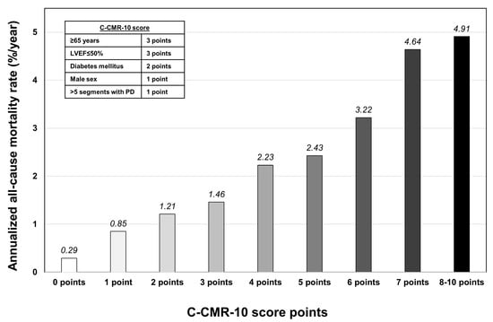 Annualized all-cause mortality risk stratification according to clinical-stressCMR (C-CMR-10) score points. Abbreviations: LVEF = Left ventricular ejection fraction. stressCMR = Vasodilator stress cardiac magnetic resonance. PD = Perfusion defects on stressCMR.