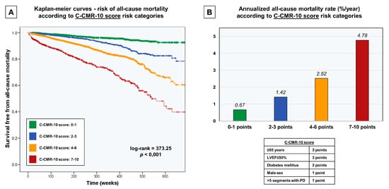 An increase in the number of points in the C-CMR-10 score displayed a strong linear association with a higher annualized all-cause mortality rate, ranging from a very low risk of 0.29%/year when zero points were scored to the highest risk (>4.6%/year) when ≥7 points were scored (Figure 3). We distributed the population in four risk categories according to the C-CMR-10 score: low risk (0–1 points), low-intermediate risk (2–3 points), intermediate-high risk (4–6 points) and high risk (7-10 points). This categorization permitted an intuitive stratification of the risk of all-cause mortality as derived from survival curves (Figure 4A) and annualized all-cause mortality rates (Figure 1B and Figure 4B).