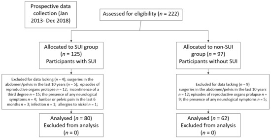 | Variables | SUI Group (n = 80) | Non-SUI Group (n = 62) | p-Value * | ||||||
