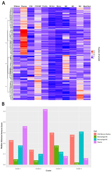 Patients were divided into four distinct clusters based on the relative fractions of immune cell subsets within the TIME; 139 (28.0%) patients were grouped into cluster 1 (CD4 Memory Resting T cell [CD4 MR]HighPlasma CellHighM0LowM2Mid), 115 (23.2%) in cluster 2 (CD4 MRLowPlasma CellHighM0LowM2Low), 112 (22.6%) in cluster 3 CD4 MRHighPlasma CellLowM0HighM2Low), and 126 (25.4%) into cluster 4 (CD4 MRHighPlasma CellLowM0LowM2High) (Figure 1A). The absolute immune cell infiltration in each cluster was determined by the CIBERSORT absolute immune score output and displayed in Figure 1B. Pairwise t-tests were conducted to confirm significant differences between cell types between clusters (Table A1). All clusters demonstrated significantly different levels of each type of immune cell infiltrate (p < 0.05) except for M0 macrophages in clusters 1 versus 2 (p = 0.937) and CD4 MR in clusters 3 vs 4 (p = 0.46). Only immune cell subsets with non-zero median expression were displayed in Figure 1. Full unsupervised hierarchical clustering for 22 immune cell subsets can be visualized in Figure A1.