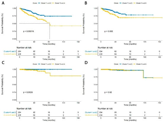 Panel (A) demonstrates the Kaplan–Meier curve for progression-free survival for grouped clusters 1 and 2 versus grouped clusters 3 and 4 (HR 2.243, 95% CI 1.458–3.450, p = 0.0002). (B) Biochemical recurrence (HR 2.128, 95% CI 1.302–3.479, p = 0.0026). (C) Distant metastasis (all events occurred in clusters 3 and 4, p < 0.0001). (D) Overall survival (HR 0.9319, 95% CI 0.2488–3.49, p = 0.917).