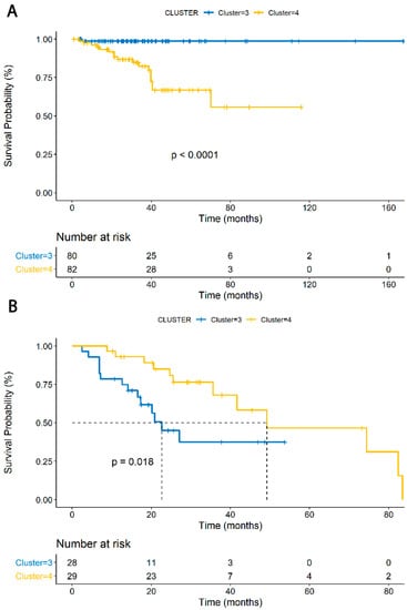 Panel (A) demonstrates progression-free survival for only patients receiving surgery in cluster 3 vs. 4, with cluster 4 displaying significantly worse progression-free survival (HR 18.1, 95% CI 2.41–135.5, p < 0.0001). Panel (B) displays progression-free survival for patients receiving both surgery and radiation in cluster 3 vs. 4, with cluster 3 displaying significantly worse progression-free survival (log-rank p = 0.018; HR 0.368, 95% CI 0.1568–0.8642, p = 0.0217). The Kaplan–Meier curves are color-coded, with figure legends at the top of each panel.