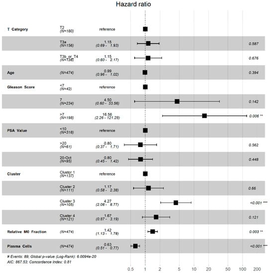 Multivariable analysis with hazard ratio (HR) represented in a Forest plot adjusting for age, pathologic T-stage, Gleason score, baseline PSA value, cluster, and fractions of predominant cells, including M0 macrophages and plasma cells. Clusters, cell types, and clinical risk factors are located in the left column, while hazard ratio calculations are located in the right column. ‘**’ denotes significance, 0.001 > p > 0.05, and ‘***’ denotes significance, p < 0.001.