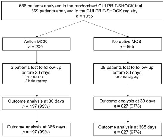 Thirty-one (3%) patients were lost to follow-up before 30 days (1 in the randomized trial and 30 in the registry study). Thus, the primary endpoint could be analyzed in 197 patients with active MCS and 827 patients without active MCS (Figure 1). A second patient in the randomized trial and 10 patients in the registry study were additionally lost to follow-up before 1 year. For the survival analysis, these patients were censored at the last date of follow-up.