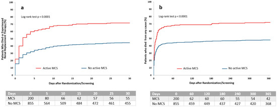 Kaplan–Meier curves of the time to the occurrence of the primary endpoint of all-cause death or renal replacement therapy at 30 days (a), and 1-year mortality (b). MCS = mechanical circulatory support.