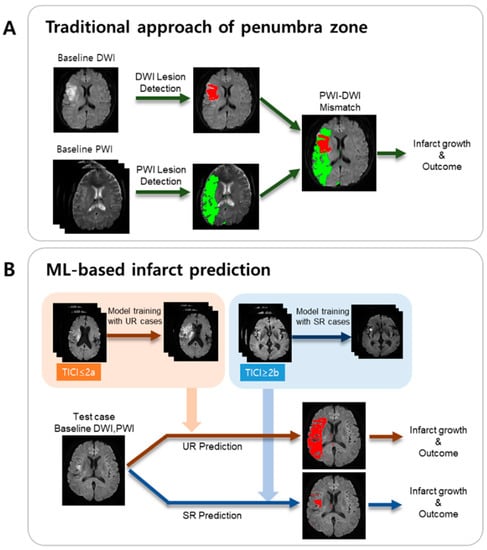 Machine learning (ML) has emerged as a promising methodology in acute stroke neuroimaging to predict ischemic stroke growth by interpolation of shape representations [9], and to predict the voxel-based tissue outcome [10,11] and the clinical outcome [12]. In particular, an ML method, referred to as fully automated stroke tissue estimation using random forest classifiers (FASTER) [13], showed potential to accurately predict final lesion volumes in cases of SR and unsuccessful recanalization (UR). However, the study did not investigate the performance of ML-based infarct growth estimation in comparison with target mismatch based on PWI–DWI mismatch volume and did not evaluate the prediction of clinical outcomes according to ML-based infarct growth estimation.
